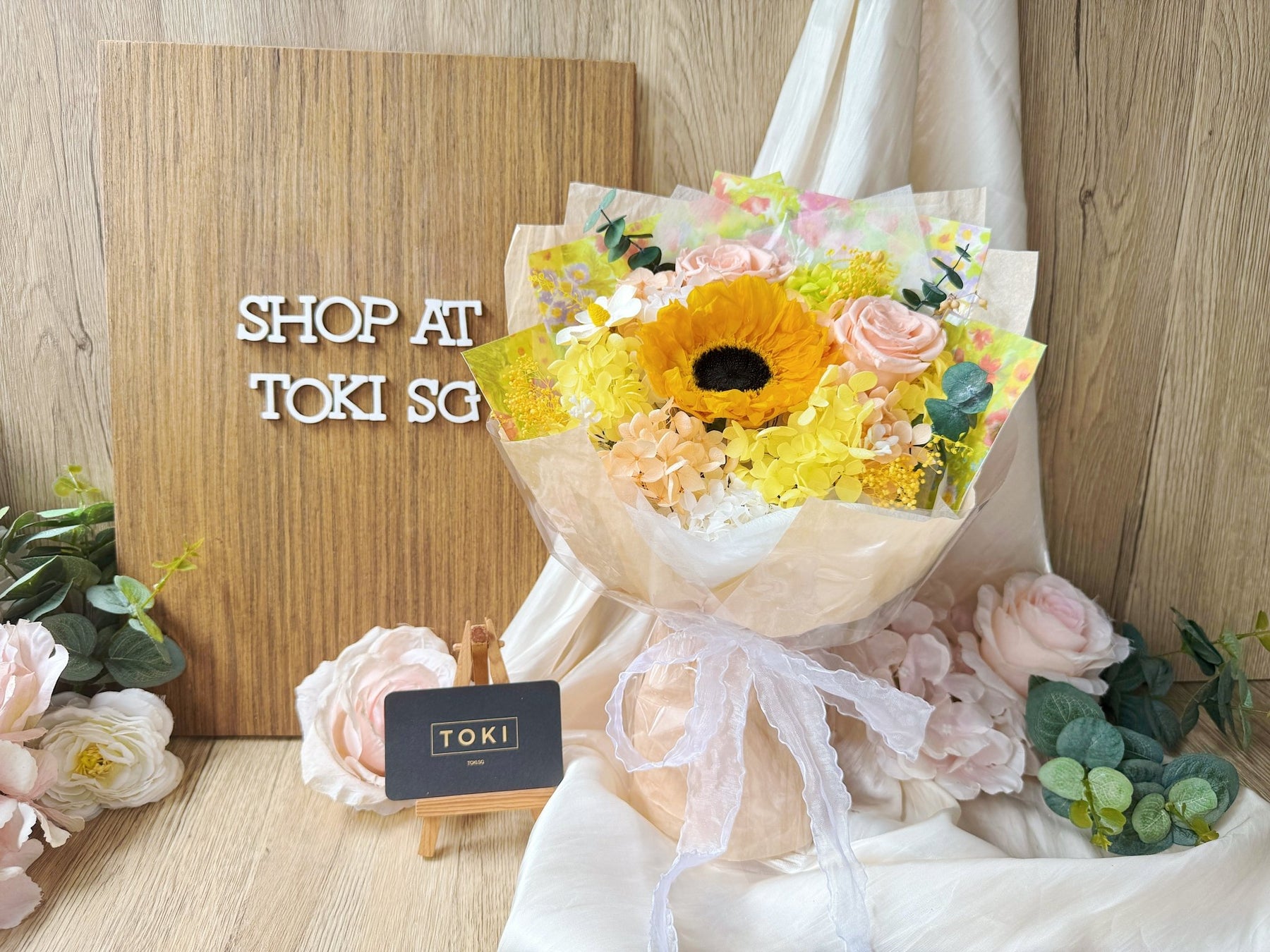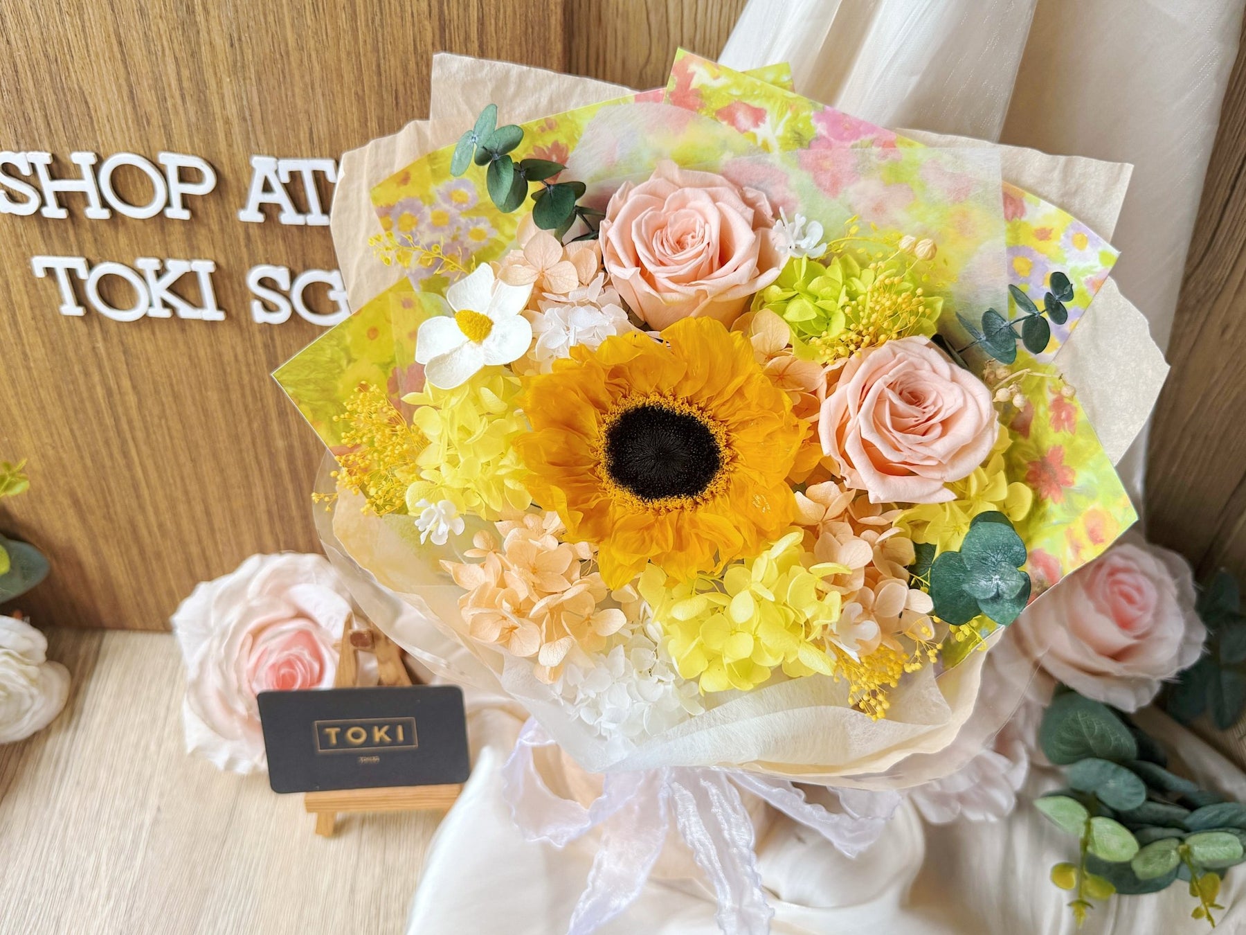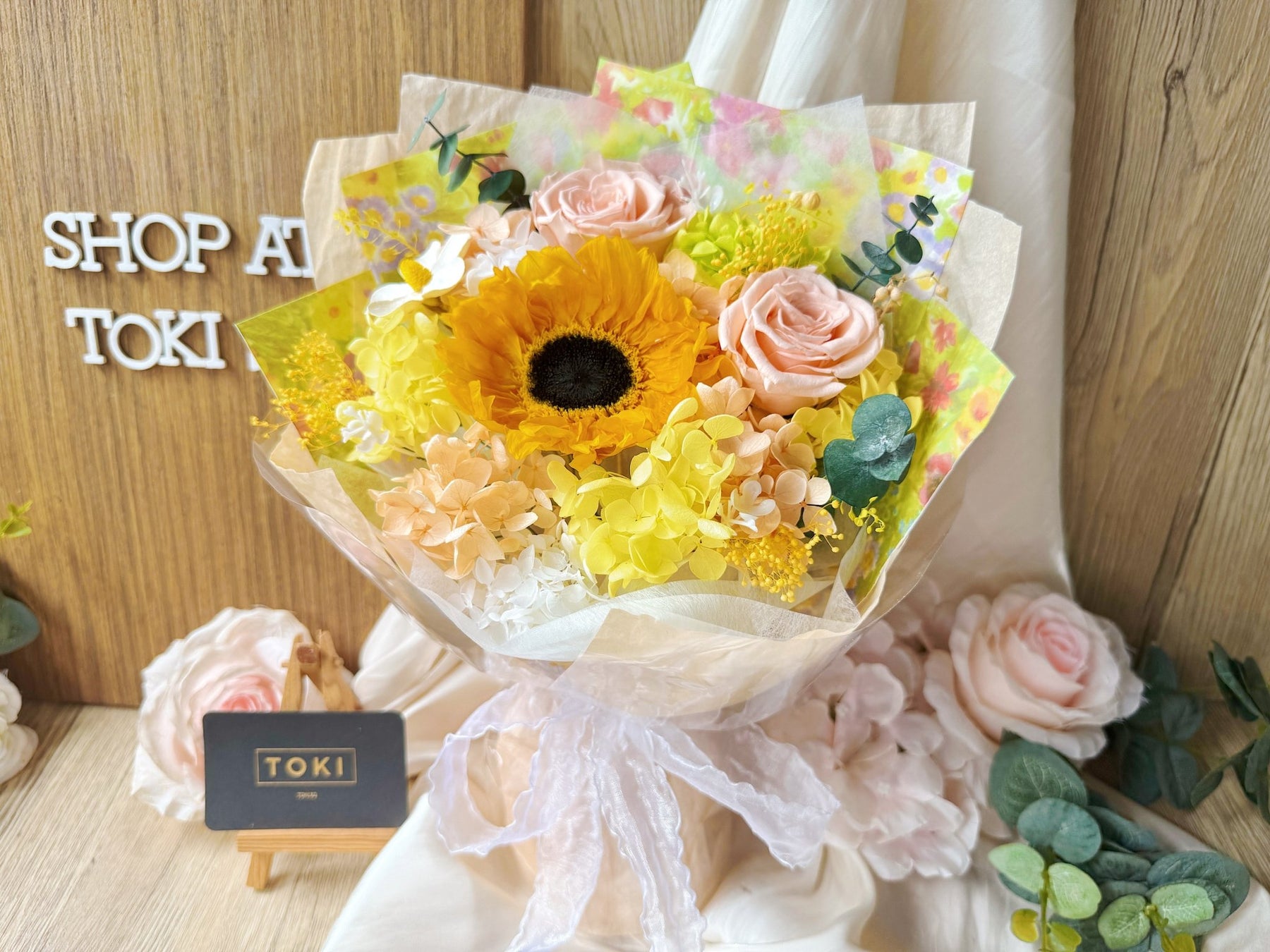 Bring timeless elegance with this preserved bouquet. It features one sunflower and two roses, capturing garden vibes that last months. Perfect for gifting on any occasion, from milestones to gratitude. The blooms require minimal care, ideal for those who love fresh florals without maintenance. A thoughtful present that keeps on giving. Perfect for graduation, birthdays, anniversaries, or surprise gifts
