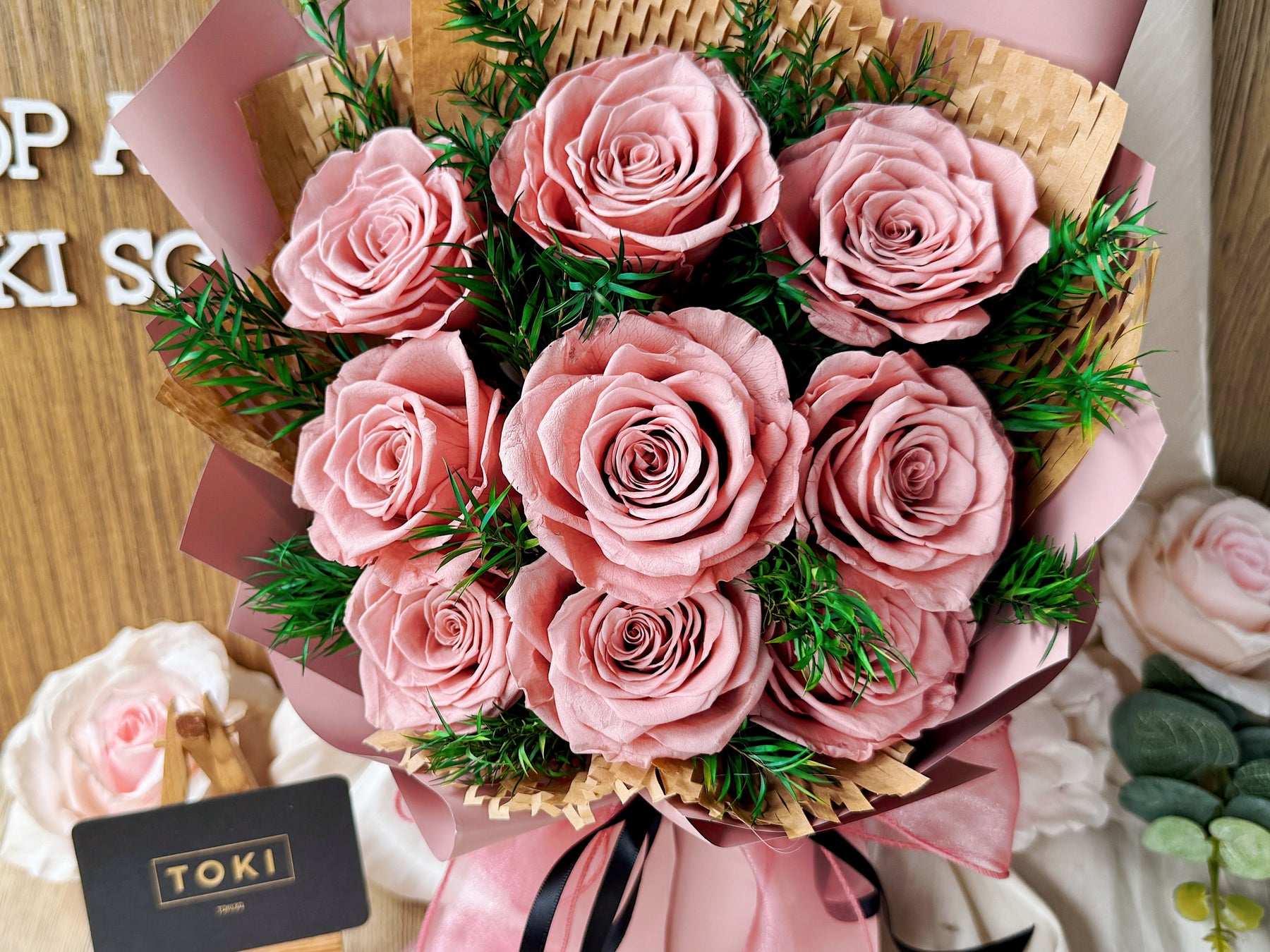 Eternal beauty captured in a timeless bouquet. Nine preserved roses paired with green leaves to create an effortless, classic arrangement that lasts for months. Perfect for expressing love, gratitude, or simply brightening any space. Each bloom is carefully preserved to maintain its natural elegance without the need for water or maintenance. A gift that endures.